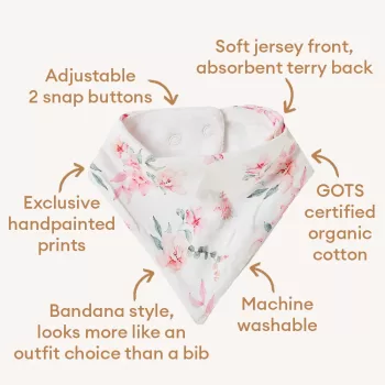 Our bandana dribble bibs feature our exclusive prints on one side and luxurious organic terry cotton on the back. This dribble bib features our beautiful Camille print. The bibs come with two easy snap buttons to adjust the fit and are machine washable. Our bibs make great gifts too.